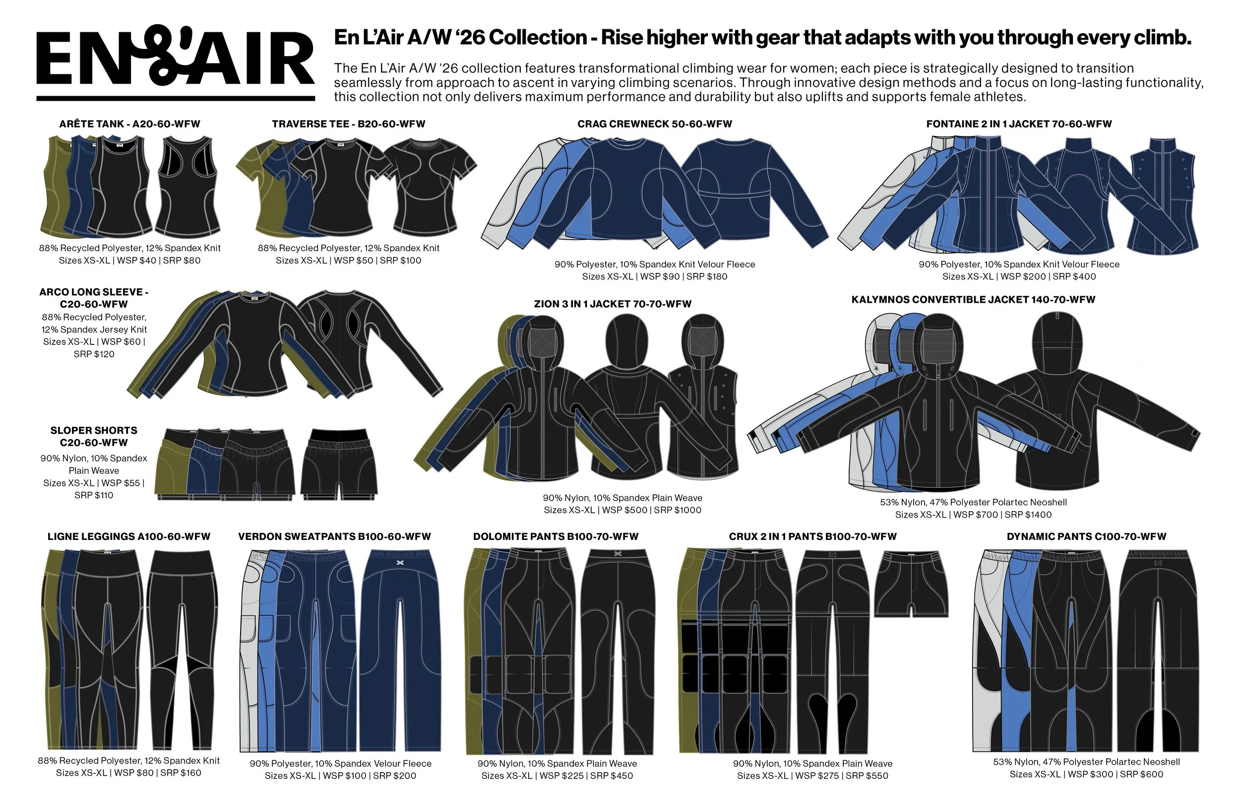 Line plan created in Adobe InDesign for my Women’s Climbing Wear Collection. View full project here.